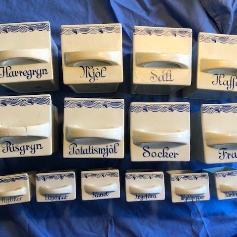 Köksburkar i porslin för köksförvaring. Setet består av flera burkar med lock, märkta med olika innehåll potatismjöl, frukt, socker, kaffe havregryn och risgryn. Burkarna är vita med dekorativ bård med blommotiv upptill. Passar för förvaring av torra livsmedel eller som köksdekoration.