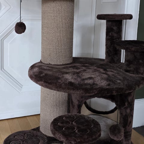 Kattmöbel i form av ett cylindriskt torn med klösvänlig textil på utsidan och flera runda öppningar med hängande leksaksbollar. Ovandelen har en vadderad, avtagbar liggplats i mjuk grå textil. Möbeln fungerar både som klöspelare, gömställe och viloplats för katt.