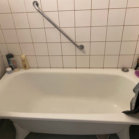 Badkar i vit standardmodell. Rektangulär form med släta innersidor och avlopp i ena änden. Passar för installation i badrum med kaklade väggar eller liknande. Mindre märken och slitage förekommer invändigt enligt bilderna men påverkar inte funktionen.