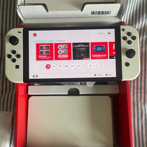 Nintendo Switch OLED spelkonsol i vit färg med tillhörande vit docka.