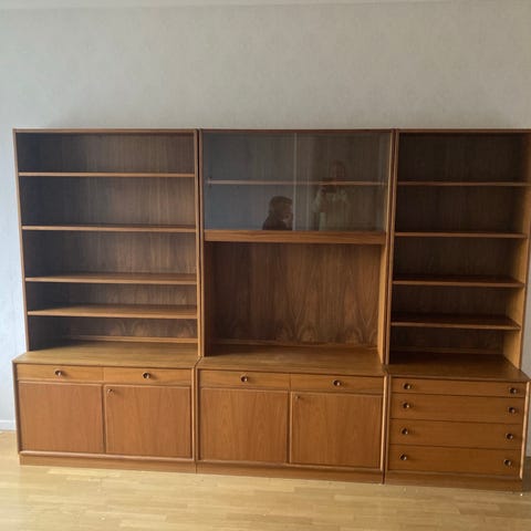 Två matchande bokhyllor i teak, klassisk modell i två delar: underskåp/sideboard och överdel med hyllplan.
