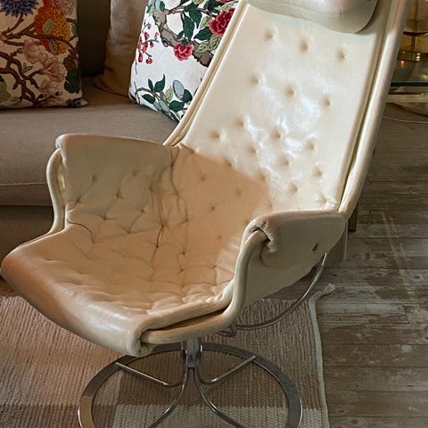 Jetson fåtölj DUX Bruno Mathsson i vitt läder med snurrfot i metall. Inköpt på auktion, är i väldigt bra skick. Inga skador eller större fläckar. Två fåtöljer finns, säljer egentligen bara en men för rätt pris kan jag sälja båda. Båda fåtöljerna är i väldigt bra skick.