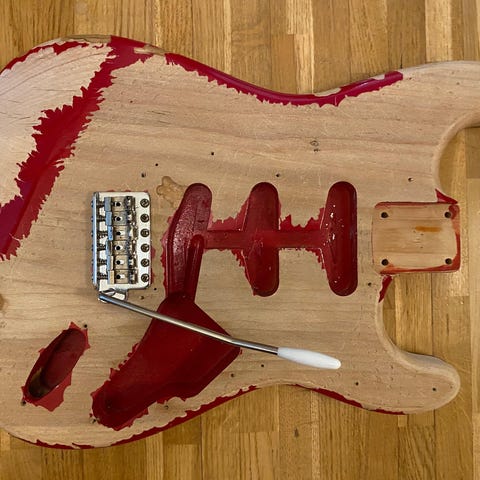 Skulle bli en fin „black strat“, men tiden räcker inte till. Väger ca. 1,8 kg på köksvågen.