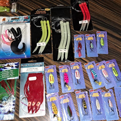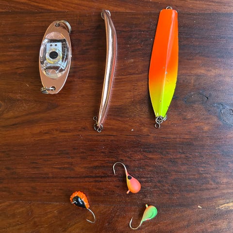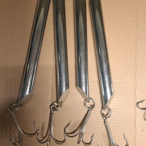 Sölvkroken norway, Flera pilkar med trekrokar och vissa med röd plastdetalj vid kroken. Passar för olika typer av fiske efter stors fiskar i djupet.