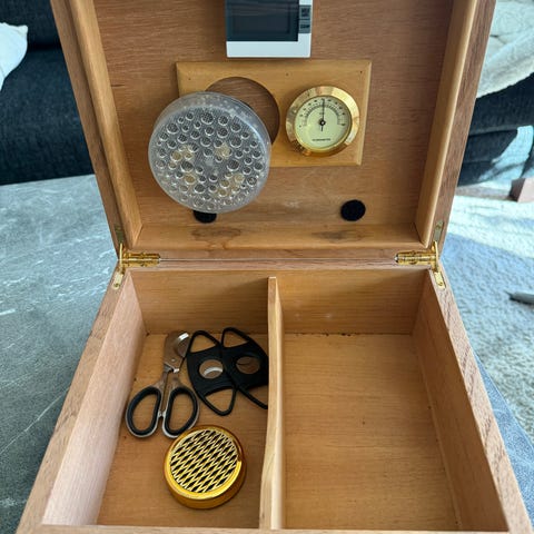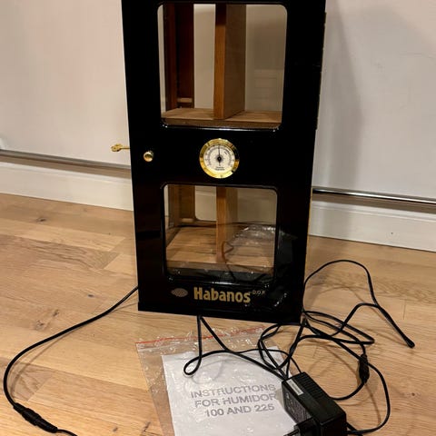 Humidor cigarrlåda i trä med mörkbrun faner på utsidan och ljusare trä invändigt. Lådan har hygrometer i locket för kontroll av luftfuktighet. Invändigt finns löstagbar insats med slitsar och fackindelning för cigarrer samt ett större fack under. Utsidan är blankpolerad och lådan stängs med lås och nyckel. Lämplig för förvaring av cigarrer i hemmet eller på kontor.
