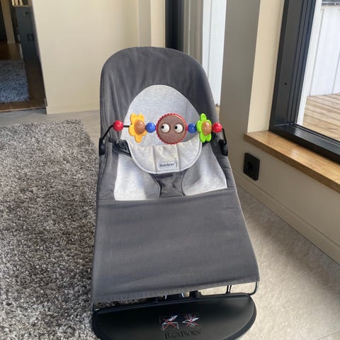BabyBjörn babysitter i svart och grå färg. Modellen är hopfällbar och kan justeras i olika lutningslägen. Sittdelen är i tyg med stöd för rygg och huvud samt säkerhetssele framtill. Passar för spädbarn och småbarn enligt tillverkarens rekommendationer. Lätt att flytta mellan rum och kan förvaras platt när den inte används.
