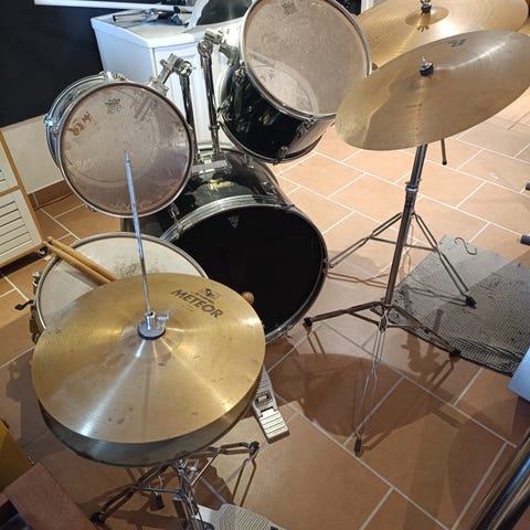 Tjena, det är nu dags att sälja mitt trumset då jag inte använt det på över 2 år och står just nu bara och tar plats. Detta är BDK-22 trumset från Gear4music i silver sparkle färg. Trummorna är i gott skick och allt fungerar jättebra, man kan se på bilderna att det är använt en del från när jag spelade förut (slag märken) men inget som påverkar hur bra det fungerar. Detta trumset är väldigt simpelt och oavancerat, perfekt för en nybörjare som jag själv var när jag köpte det. 3 olika slagverk kommer med samt sittpall/stol och ett notstativ ingår också.