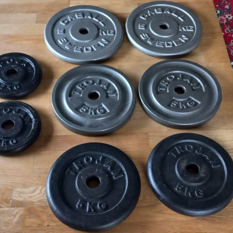 Skickar med 2st hemmagjorda 20kg vikter till 25mm skivstång.