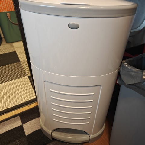 Ubbi blöjhink i vit färg. Hinken är avsedd för förvaring av använda blöjor och har lock med öppning upptill. Passar för användning i barnrum eller badrum. Kompatibel med vanliga soppåsar enligt tillverkarens standard (modell utan särskilda kassettpåsar).