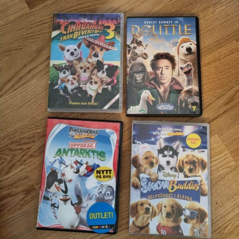 Paket med 4 dvd-filmer för barn. Innehåller tre Disney-filmer samt en Bamse-film. Filmerna är tecknade familje- och barnfilmer och levereras i sina respektive dvd-fodral. Passar för uppspelning i standard dvd-spelare.