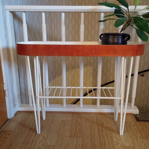 Fint retroblombord med spalje. Åldersrelaterade märken och slitage finns (se närbilder) men den är hel och stabil. Måtten avser det högsta och bredaste stället på spaljen från golvet men spaljen kan enkelt lyftas av från själva bordet för enkel transport (se den sista bilden).