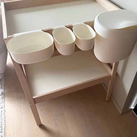 Stokke skötbord i trä med överdel anpassad för skötbädd. Bordet har en övre yta för blöjbyte och en nedre hylla som ger extra förvaringsutrymme för blöjor, kläder och andra tillbehör. Passar för användning i barnrum eller badrum där en stabil skötyta behövs.