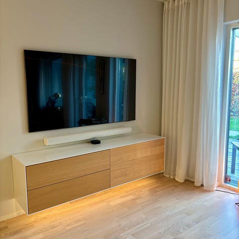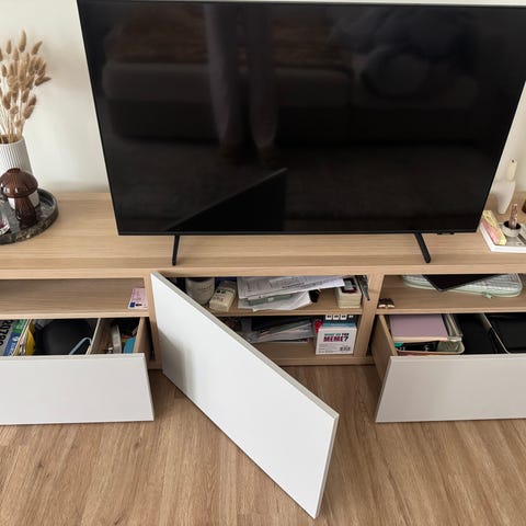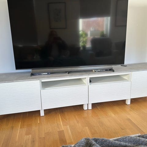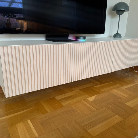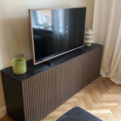 IKEA tv-bänk i brun träfinish med räfflad front och skiva i sten.