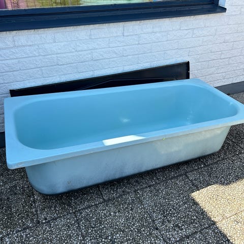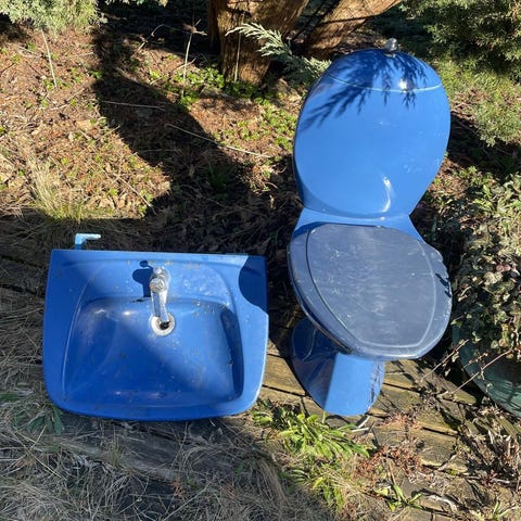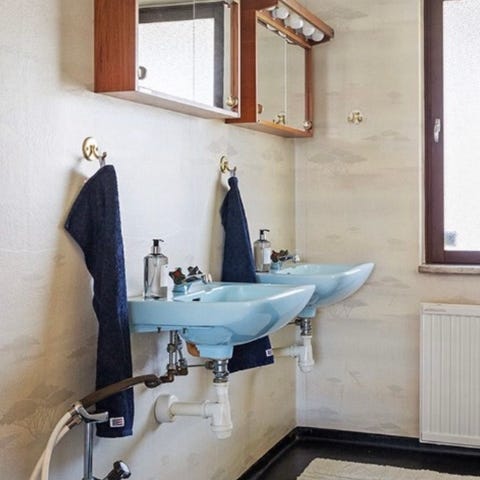 1970- tal Badrumsinredning bestående av två väggmonterade tvättställ med chromade pelare, ett badkar och en toalettstol i gul färg. Spegel, skåp samt toarullehållare.