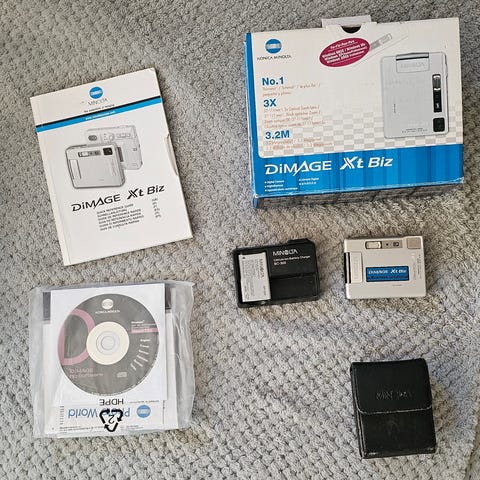 Minolta Dimage Z3 digitalkamera i svart utförande. Kameran har inbyggt objektiv med 12x optisk zoom och bildstabilisering (Anti-Shake). På ovansidan finns programratt med olika exponeringslägen och motivprogram. Baksidan har LCD-skärm, optisk sökare och knappar för meny, visning och inställningar. Kameran har handgrepp på högersidan och levereras med bärrem, enligt bilderna. Passar för allmän fotografering där man vill ha en kompakt kamera med lång zoom.