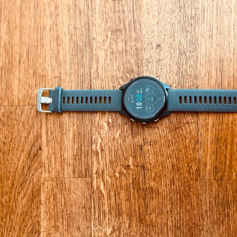 Hylsan på bandet saknas (se bild), därav priset. Påverkar inte användningen av klockan men nytt band går att köpa hos Garmin om så önskas.