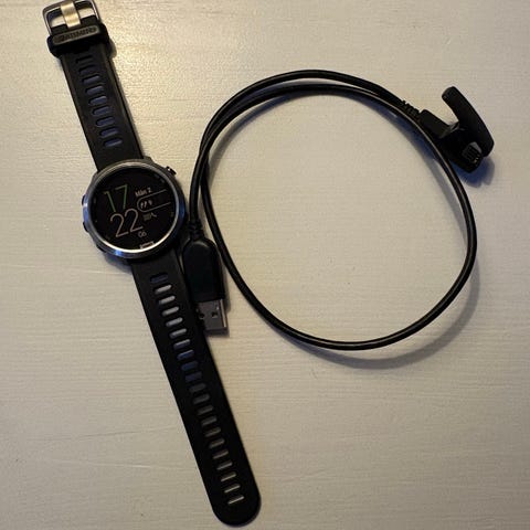 Garmin Forerunner sportklocka i svart. Medföljande USB-laddkabel med klämkontakt ingår.