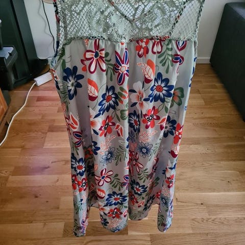 Väldigt vacker tunn klänning med ett blommigt mönster i rosa och gröna toner. Klänningen är ärmlös och har en markerad midja, spetsdetaljer och dubbelt tyg. Översta tyget är genomskinligt. Innertyget är tjockare och känns väldigt mjukt som siden.