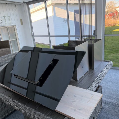 Väggmonterad köksfläkt i svart glas med detaljer i rostfritt stål. Fläkten har lutande frontlucka i glas, inbyggda spotlights och metallfilter som kan tas loss för rengöring. Avluftningsanslutning finns på baksidan samt elsladd med stickkontakt. Passar för montering ovan spis eller häll i kök där man önskar väggmonterad fläktlösning.