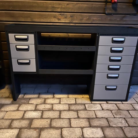 bilinredning verkstadsmodul i metall med flera utdragslådor och öppna fack. Inredningen består av två lådsektioner med sammanlagt flera lådor i grå färg samt perforerade sidopaneler för upphängning av verktyg eller tillbehör. Stabil stålkonstruktion som kan användas som förvarings- och arbetsmodul i skåpbil eller garage.