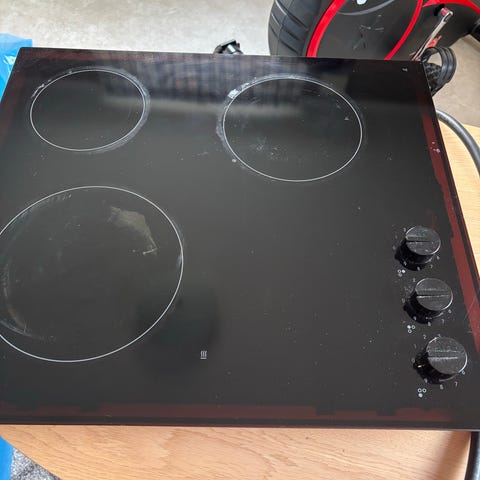 Använd men fungerande, ej induktion. Fläckarna på bilden är bara smuts och byggdamm. Det är repor i glaset, men ingen fel på funktionen. Troligtvis IKEA, men osäker.
