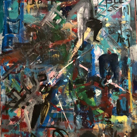 Oljemålningar av okänd konstnär med abstrakta motiv. Färgstarka kompositioner i gröna, blå, röda och gula toner. Målningarna är utförda med tydlig struktur i färgskikten och har synliga penseldrag. Passar som väggkonst i hem eller ateljé. Ram i trä syns på en av målningarna. Exakta mått och årtal är okända.