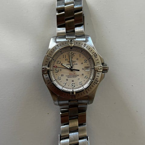 Mycket väl omhändertagen med originalarmband kvar. Just nu sitter det en NATO-strap från Breitling på, som även det följer med vid eventuell affär.