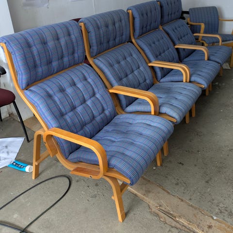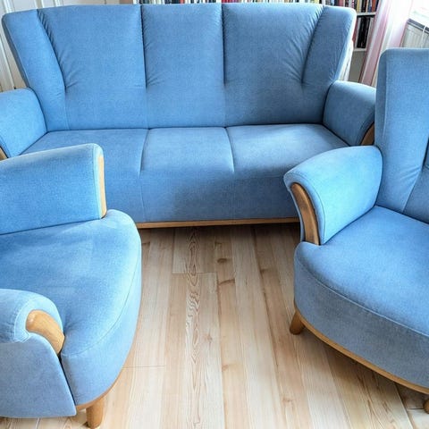 Bruno Mathssons klassiska Mina. Klädda med stålblått tyg.