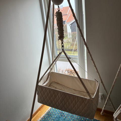Moonboon Classic Bundle. Paketet inkluderar en vagga, ett stativ, en motor 2.0, en madrass, ett vattentätt madrasskydd, ett lakan och en sänghimmel. Vaggan har en platt botten och är designad för att ge en bekväm sovmiljö för barnet. Sänghimmelen är tillverkad av ekologisk bomull. Priset ingår allt inklusive: stava, två fjäder, hammock säng och plattsäng, och tre madrasser. Måste hämta från Skogås.