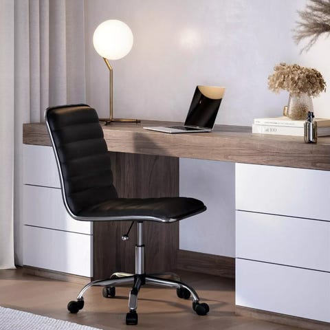 IKEA skrivbord i två utföranden. Ett skrivbord i svart med slät bordsskiva och raka ben, lämpligt som arbetsplats eller sminkbord. Det andra skrivbordet har vit bordsskiva med vita ben och en separat vit hurts med flera lådor för förvaring av kontorsmaterial eller tillbehör. Passar i hemmakontor, tonårsrum eller som studieplats. Materialet är en kombination av träbaserade skivor och metallben enligt typisk IKEA-konstruktion.