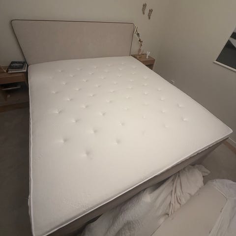 Vit textilklädsel på både madrass och underdel.