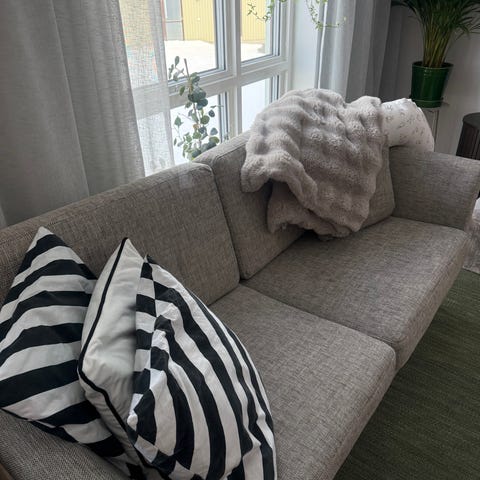 Mio soffa i grått tyg. Soffan har flera sittdynor och ryggkuddar samt rak rygg. Passar för vardagsrum eller tv-rum och kan kompletteras med soffbord och textilier efter behov. Färgen är neutral grå och tyget ger ett mjukt och ombonat intryck. Köpte för 25 390 kr, säljer för 5000 kr. Pga flytt