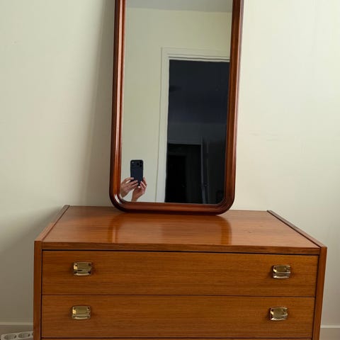 Fin spegel med rektangulär form och teakram Spegeln har upphängning på baksidan och kan placeras på byrå eller hängas på vägg. Passar i hall, sovrum eller vardagsrum som funktionell spegel och inredningsdetalj.