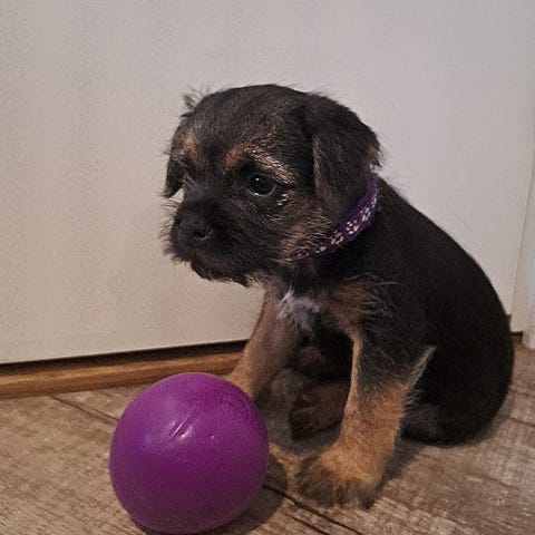 I april blir hon två år och hon älskar att springa i skogen eller leka med bollar. Oavsett väder och vind så är det livet att få springa fritt, då springer hon så öron fladdrar och hela kroppen lyser av lycka!
