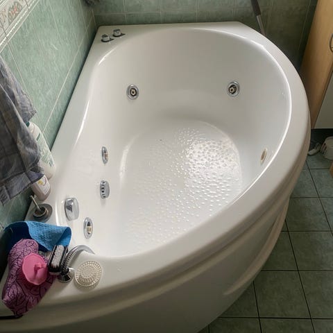 Poolspa hörnbadkar i vitt utförande. Badkaret är avsett att placeras i hörn och har inbyggd blandare med ettgreppsblandare, pip och handdusch. Passar för installation i badrum med kaklade väggar och golv. Mått 150 cm x 90 cm