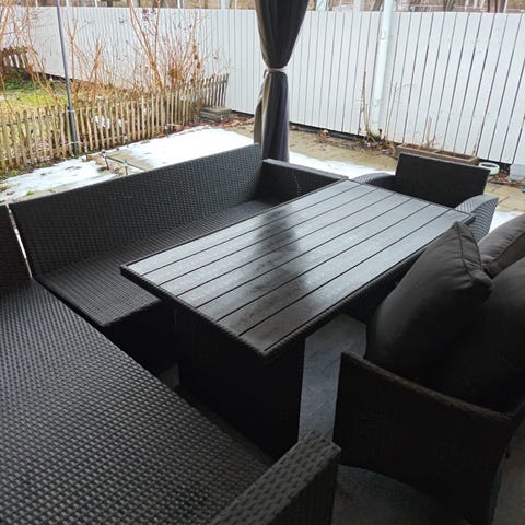 Rektangulärt matbord för utomhusbruk i mörkbrun konstrotting. Bordet har smala ben och en bordsskiva i matchande material. Passar på balkong, altan eller uteplats och kan kombineras med soffgrupp eller stolar i liknande stil. Lämpligt som matbord eller avlastningsbord vid sociala tillfällen utomhus. ca 140 cm långt