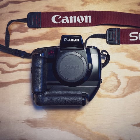 Canon EOS 5000 analog systemkamera med utbytbart objektiv. Kameran använder 35 mm film och har inbyggd ljusmätning samt olika exponeringslägen som väljs via programratten på ovansidan. Utrustad med Canon-zoomobjektiv med manuell zoom- och fokusring. Kamerahus i svart plast med inbyggd handgrepp, sökare på baksidan och LCD-display på ovansidan för inställningar. Passar för fotografering med film där användaren själv väljer filmtyp och känslighet.