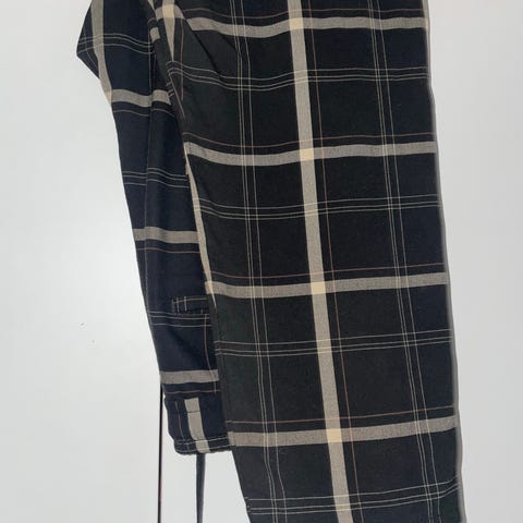 Bershka byxor för herr i storlek M. Byxorna är gråa med rutigt mönster och är tillverkade i polyester. Modellen har raka ben och synliga fickor bak. Passar som vardags- eller kontorsbyxor beroende på övrig klädsel.