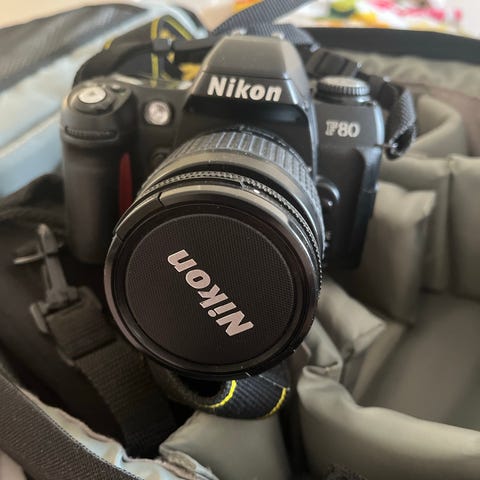 Nikon D80 digital systemkamera i svart utförande. Kamerahus för utbytbar optik med Nikon F-fattning (objektiv ingår inte). Utrustad med övre LCD-skärm, inbyggd blixtsko samt kontrollratt för olika exponeringslägen. Batterigrepp monterat för bättre grepp och möjlighet till längre batteritid beroende på batterikonfiguration. Passar för stillbildsfotografering med kompatibla Nikon-objektiv och tillbehör.