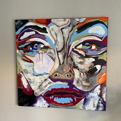 Tavla med abstrakt porträttmotiv i starka färger.