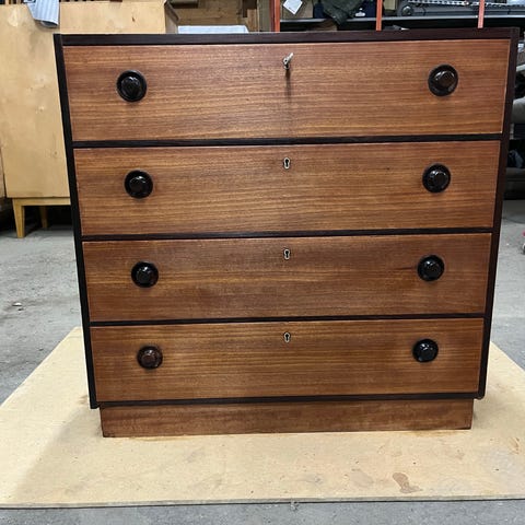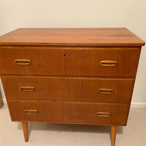 Fin 3 lådig ev 50 tals Teak byrå med mässing handtag och nyckel