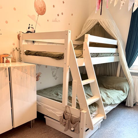 Mydal IKEA våningssäng för barn ommålad beige/grå färg. Väldigt stabil och robust. Jätte fin färg som passar både pojkar och flickor. Fint bomullstyg att hänga upp i undersidan för att få en mysig koja.
