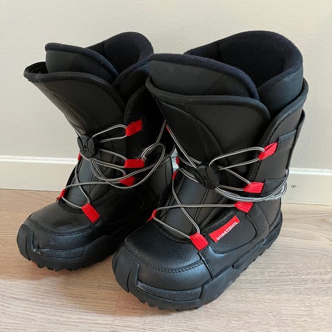 Snowboardboots i svart och grått med snörning framtill. Yttersula med grovt mönster för grepp. Invändigt foder i gul ton. Passar för snowboardåkning och vinterbruk.