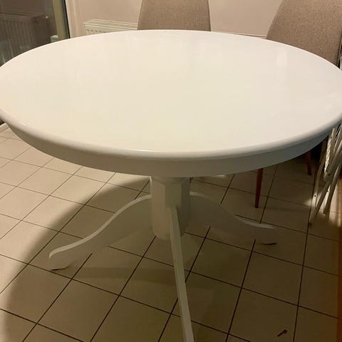 Vitt runt matbord med iläggsskiva och 4 stolar. Utan iläggsskiva = 104 cm i diameter. Med iläggsskiva mått enligt ovan.