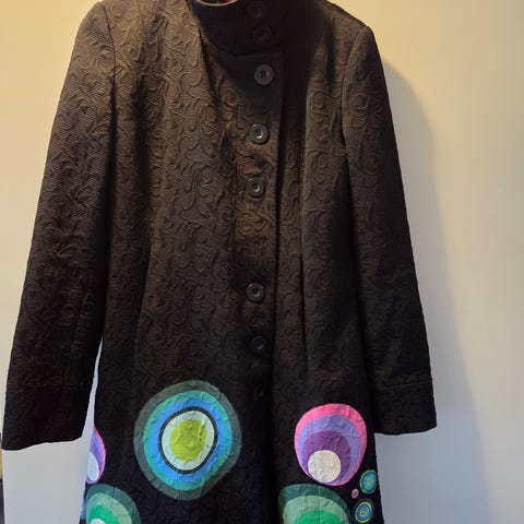 Desigual kappa för dam i storlek 42. Kappan är i lila och mörka nyanser med mönstrade partier och dekorativa knappar framtill. Tillverkad i polyester med slät insida. Modellen har krage och lång ärm samt knäppning med flera knappar. Passar som ytterplagg under svalare väder. Material- och skötselråd finns på insidan av plagget enligt tvättrådsetiketten.
