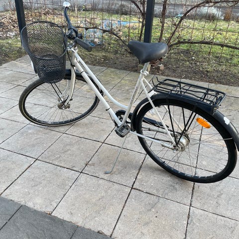 Crescent damcykel i vit färg. Cykeln har lågt insteg anpassat för kvinnor och är utrustad med pakethållare, skärmar och kedjeskydd. Passar för vardagscykling i stadsmiljö och kortare pendlingsturer. Ram, växlar. Blom motiv. Mycket fin