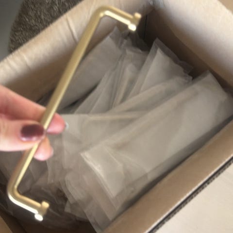 Handtag i mässing för skåp eller låda. Rakt, avlångt handtag med två fästpunkter och medföljande skruvar. Passar för montering på exempelvis köksskåp, garderober eller byrålådor där ett längre handtag önskas. Mått och exakt modell är inte angivna.mått 256mm 23st