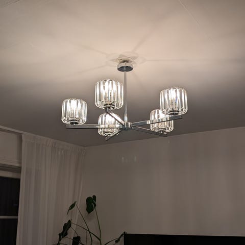 Taklampa i glas. 2 st ljustpunkter. Har några fläckar i själva mönstret, se bilder. Annars inga anmärkningar!