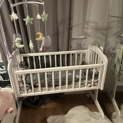 Troll spjälsäng i vit färg. Klassisk modell med ribbor runtom och hel gavelsida. Sängen kan höjas/sänkas i 3 nivåer beroende på hur gammal bebis är. Bilderna visar bottenläget. Ena väggsidan kan sänkas för att lättare kunna ta ut barnet. Eller om man vill ha den sänkt och ha som en bedside crib. Madrass med en sommar och vinter sida ingår. Även madrass skydd och lakan om det önskas. Viss slitage syns på kanterna enligt bildunderlag. Borde vara enkelt att måla över.