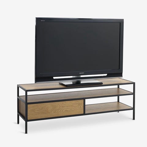 Tv-bänk med hyllplan i glas och sidor i trä. Bänken är cirka 120 cm bred, 39 cm hög och 25 cm djup. Den har tre plan med öppningar på baksidan för kabeldragning. Passar för tv och mediautrustning som spelkonsoler, digitalboxar och mediaspelare.